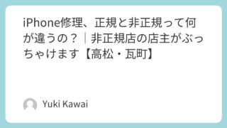 修理情報 iPhone修理、正規と非正規って何が違うの?|非正規店の店主がぶっちゃけます【高松・瓦町】 iPhone修理の正規店と非正規店の違いを、非正規修理店の店主が正直に解説。料金・修理時間・データ・保証の違いや、選び方の目安をまとめました。高松・瓦町のスマホドクター。 2026.04.08 修理情報